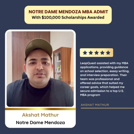 We’re thrilled to announce an inspiring milestone from the LeapQuest community! Akshat Mathur has been awarded a $100,000 MBA scholarship at the prestigious Notre Dame Mendoza College of Business for the Fall 2025 intake. …